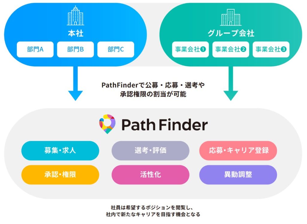 Path Finderを活⽤することで、グループ会社、部⾨は⼈⼿不⾜で社外から必要な⼈材を確保できない、業務内容のミスマッチで離職が起きるという課題を解決できます。
