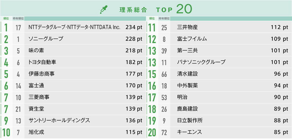 理系総合トップは、昨年17位から躍進を見せた「NTTデータグループ・NTTデータ・NTTDATA Inc.」。